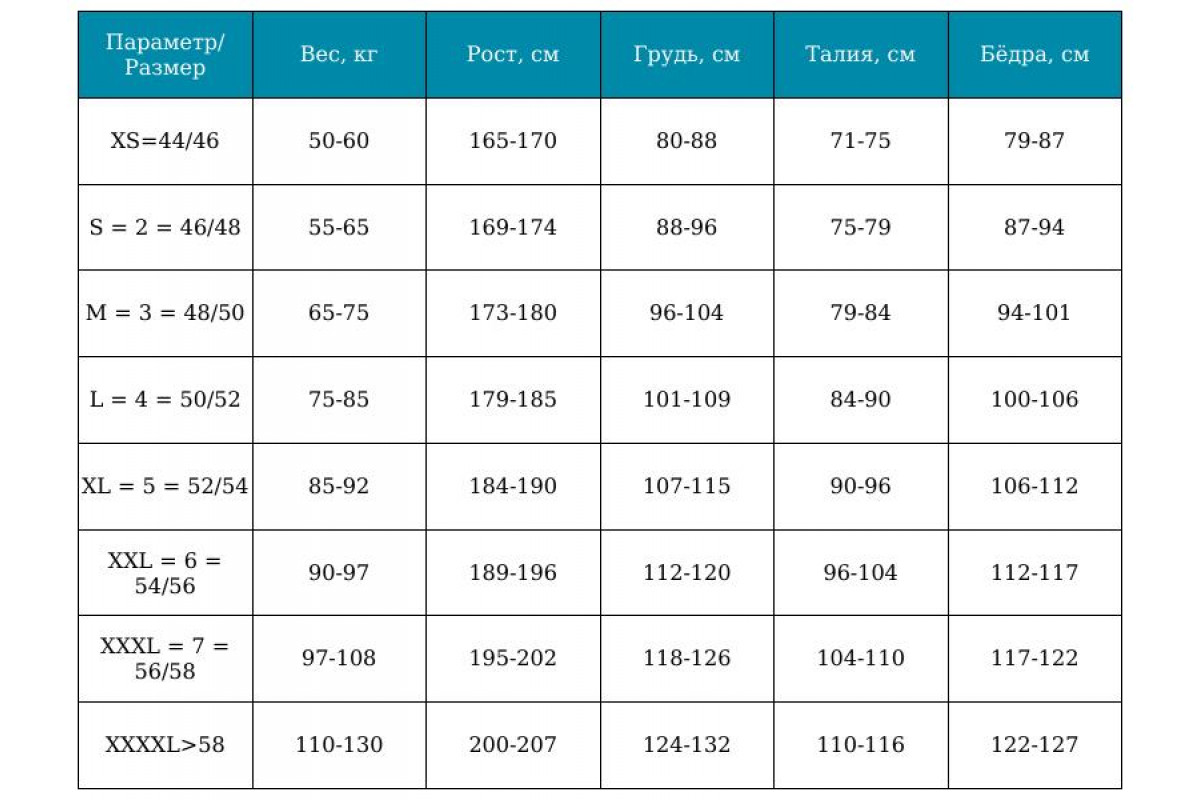 Параметр/Размер | Вес, кг | Рост, см | Грудь, см | Талия, см | Бёдра, см |