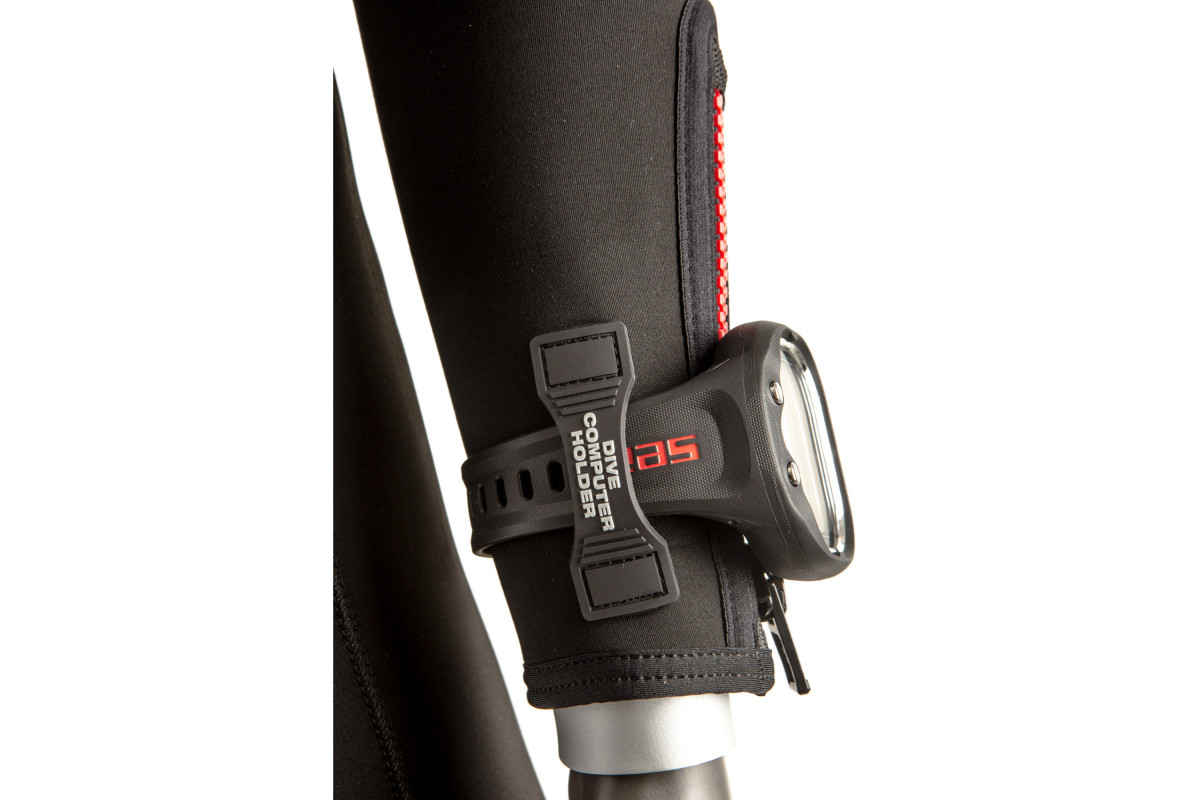 На манжете левого рукава гидрокостюма расположена резиновая вставка-петля для надежной фиксации ремешка подводного компьютера.