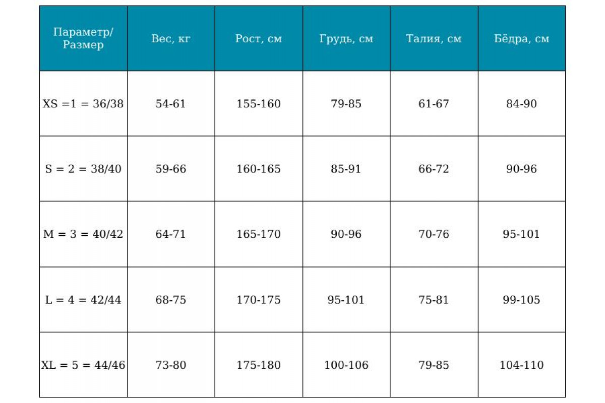 Параметр/Размер | Вес, кг | Рост, см | Грудь, см | Талия, см | Бёдра, см |
