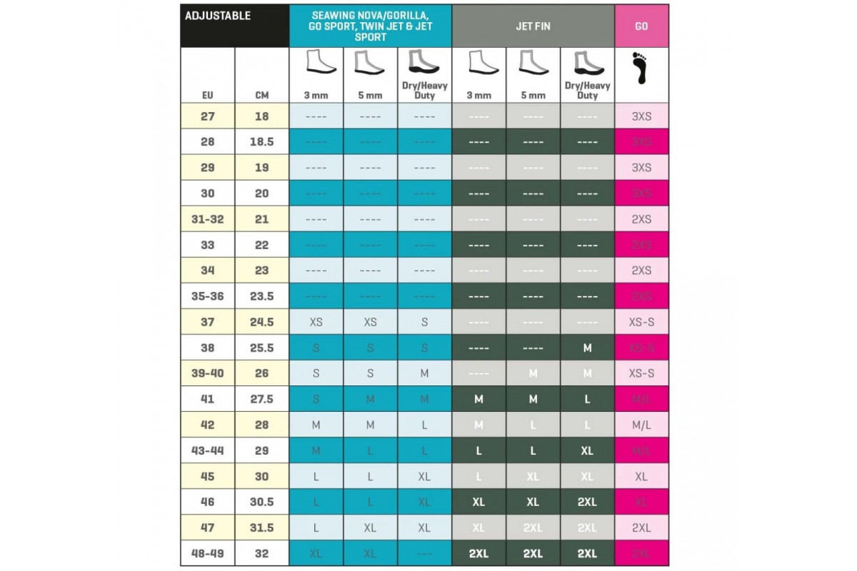 Размерный ряд и габариты ласты SCUBAPRO GO FIN SPORT: