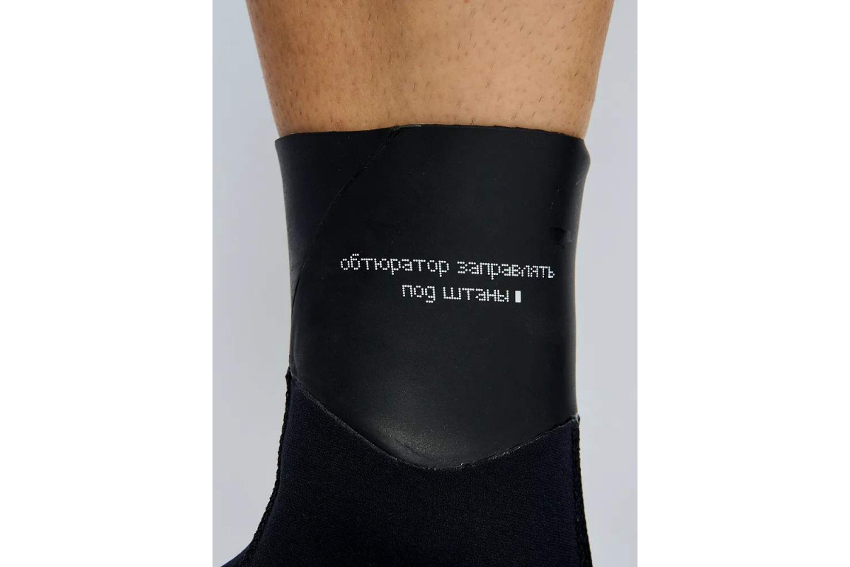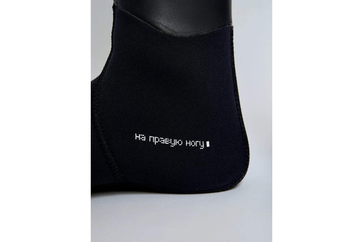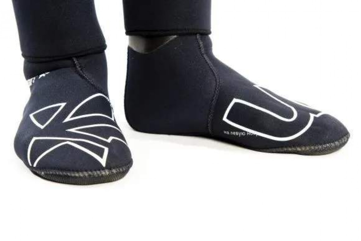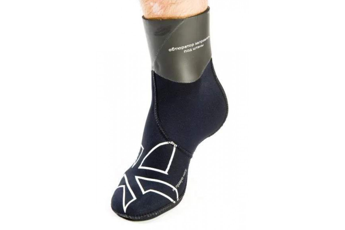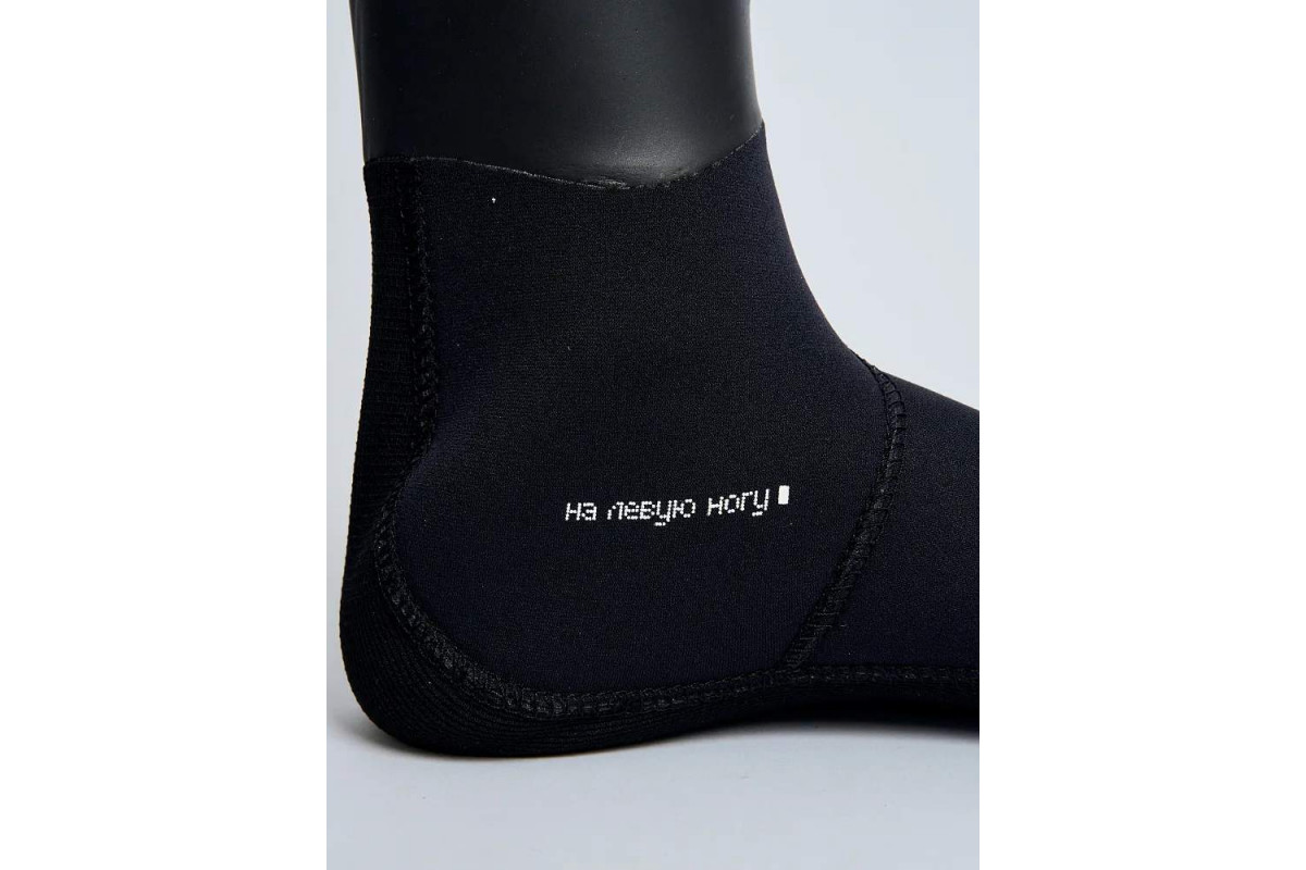 Анатомическая форма носков разработана с учетом угла наклона ступни в рабочем положении — при гребке. Удлиненные, плавно изогнутые линии швов минимизируют нагрузки перпендикулярных линий шва, что повышает комфорт и снижает риск дискомфорта во время активного использования. Обтюратор носков вывернут голой резиной наружу для максимальной герметичности соединения с обтюратором штанов гидрокостюма. Подошва усиленна материалом Supratex, что значительно увеличивает срок службы носков и защищает от механических повреждений.