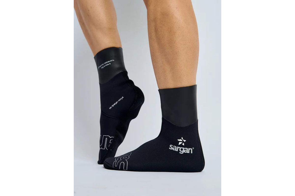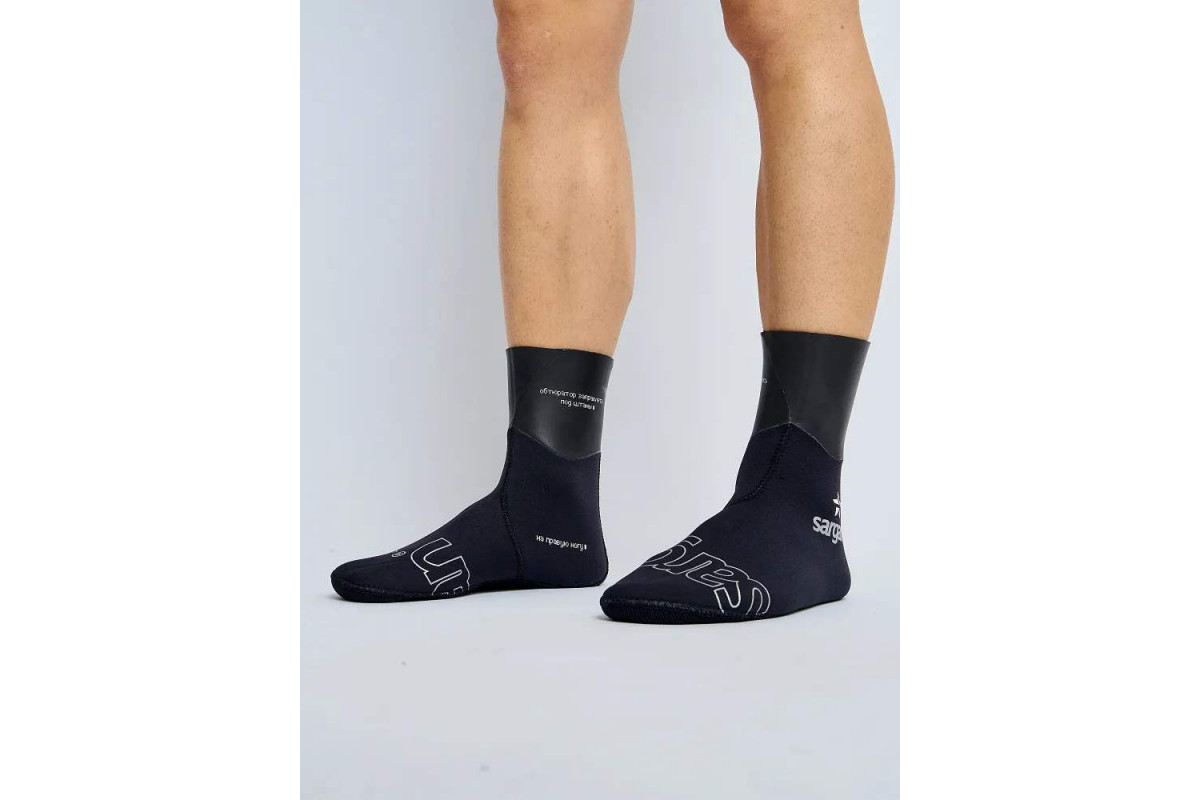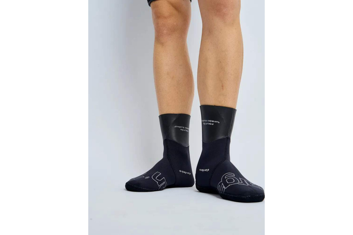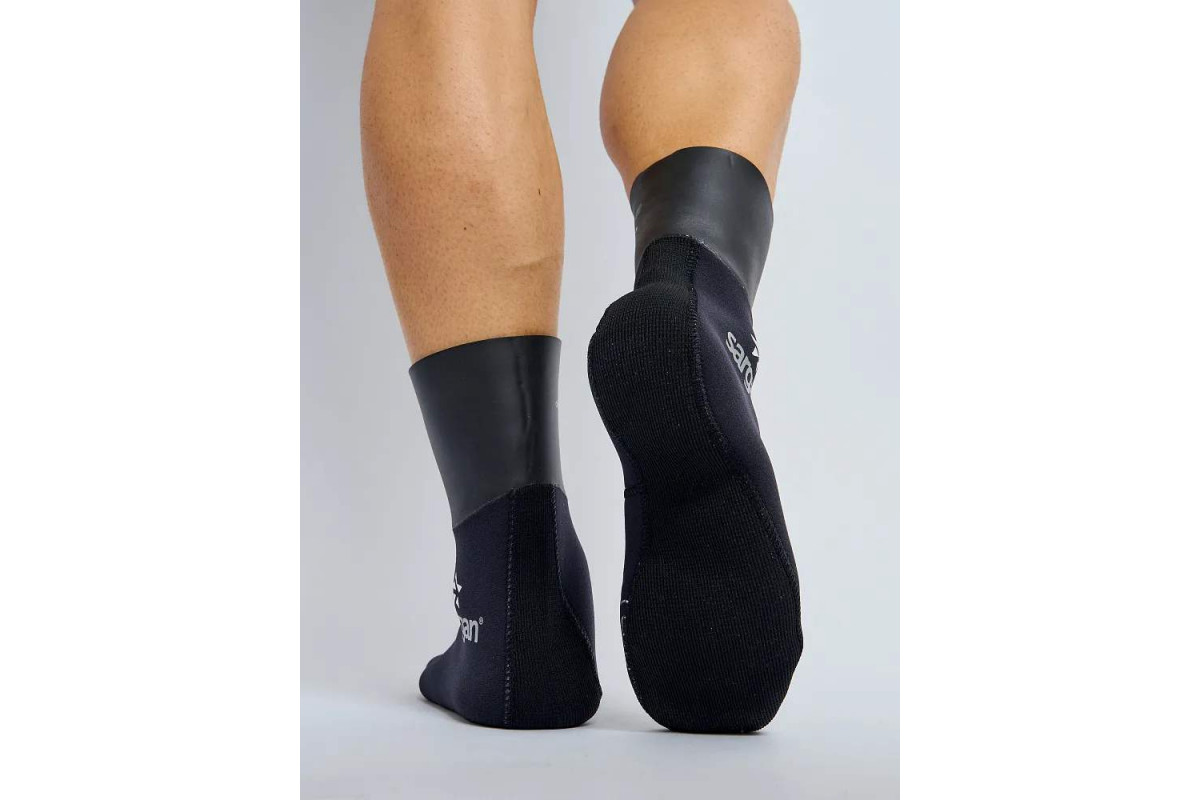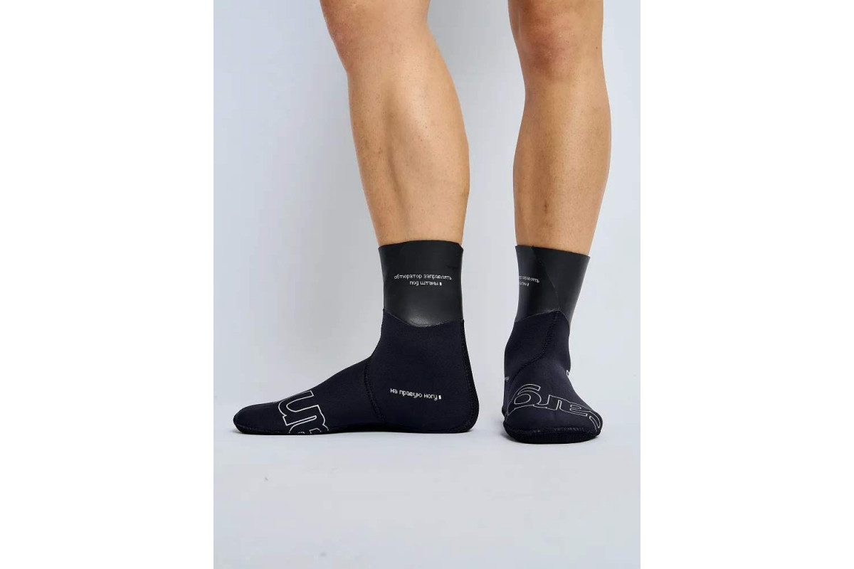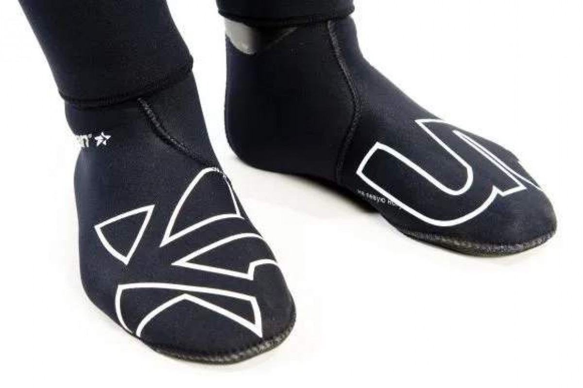 Анатомическая форма носков разработана с учетом угла наклона ступни в рабочем положении — при гребке. Удлиненные, плавно изогнутые линии швов минимизируют нагрузки перпендикулярных линий шва, что повышает комфорт и снижает риск дискомфорта во время активного использования. Обтюратор носков вывернут голой резиной наружу для максимальной герметичности соединения с обтюратором штанов гидрокостюма. Подошва усиленна материалом Supratex, что значительно увеличивает срок службы носков и защищает от механических повреждений.