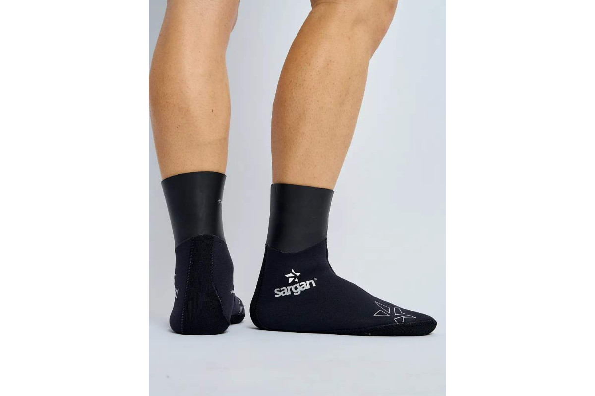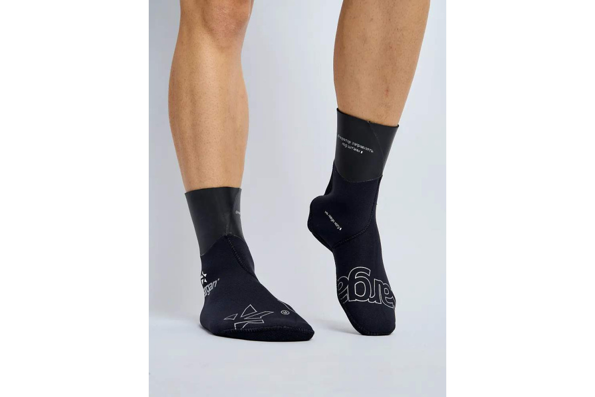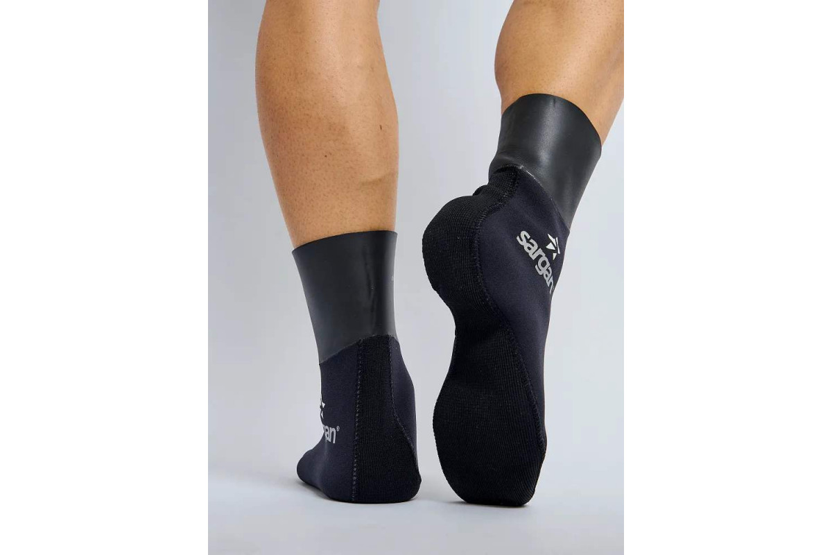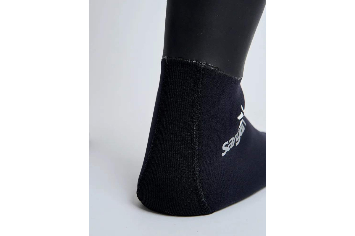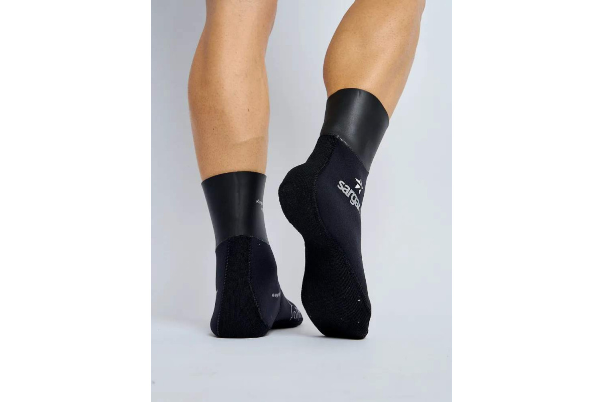 Анатомическая форма носков разработана с учетом угла наклона ступни в рабочем положении — при гребке. Удлиненные, плавно изогнутые линии швов минимизируют нагрузки перпендикулярных линий шва, что повышает комфорт и снижает риск дискомфорта во время активного использования. Обтюратор носков вывернут голой резиной наружу для максимальной герметичности соединения с обтюратором штанов гидрокостюма. Подошва усиленна материалом Supratex, что значительно увеличивает срок службы носков и защищает от механических повреждений.