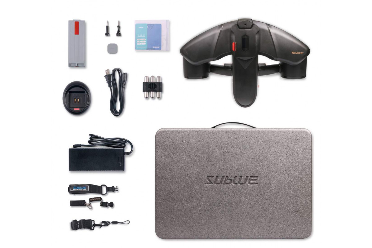 Комплект подводного скутера SUBLUE NAVBOW PLUS GREY 158 Wh включает в себя: подводный скутер, аккумулятор, зарядная станция, быстрая зарядка, страховка, страховка для управления одной рукой, компенсационные грузы, инструкция, кейс для транспортировки и хранения.