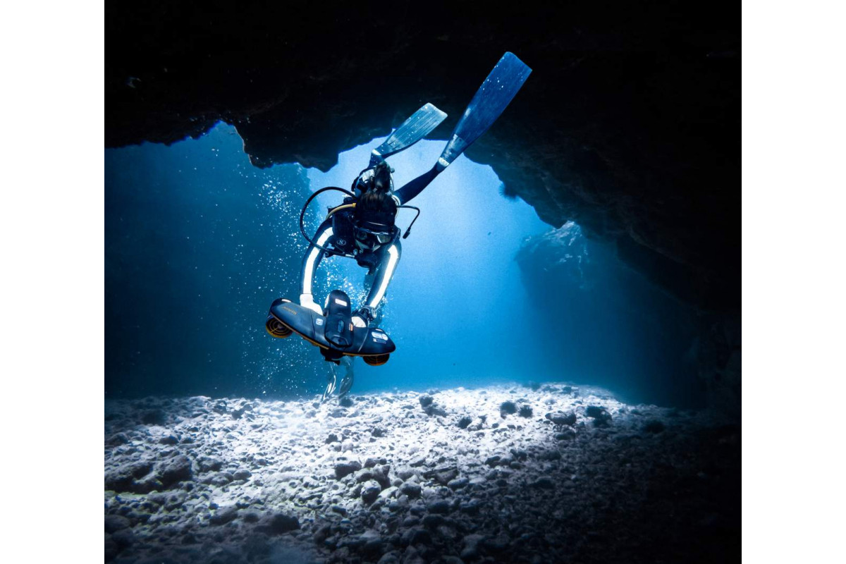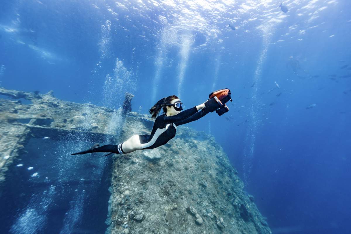 Скутер NAVBOW PLUS имеет три скоростных режима и возможность управления одной рукой, и может выполнять роль буксировщика, к примеру, для дайверов, подводных охотников, фридайверов и подводных фотографов.