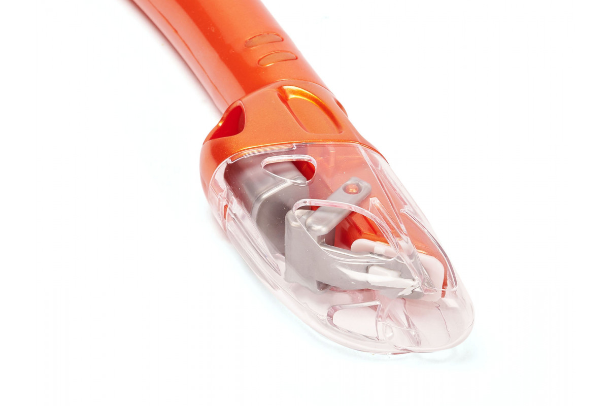 Верхний сухой клапан и нижняя дренажная камера эффективно предотвращают попадание воды в трубку. Загубник трубки, расположенный под углом, повторяет анатомическое строение челюсти, и дайвер при использовании трубки не чувствует дискомфорта, отсутствует усталость челюсти.